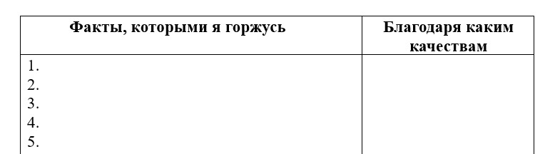 - Правая: «Качества, которые мне помогли» 3. Наполните левую колонку фактами. Выписывайте всё, что