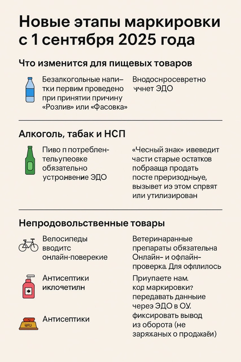 С 1 сентября 2025 года — новые правила маркировки 😎 Бизнес снова ждут перемены. Теперь под обязательную маркировку и поэкземплярный учет попадают почти все категории — от пива и БАДов до антисептиков и кормов для животных. Что это значит простыми словами? 📦 БАДы, медизделия, антисептики, ТСР — больше никаких «остатков со склада». Только поштучный учет и запрет на немаркированную продукцию. 🍺 Пиво в бутылке и банке — теперь тоже поштучный учет в ЭДО. 🚴 Велосипеды и ветпрепараты — кассы должны работать в «разрешительном режиме», плюс онлайн- и офлайн-проверка. 🐾 Корма для животных — при продаже нужно сканировать код и фиксировать вывод из оборота. По сути, бизнесу предстоит: 1️⃣ обновить кассы и ЭДО; 2️⃣ перестроить процессы; 3️⃣ избавиться от остатков, которые нельзя будет продать. 💡 И вот тут важно — мы сами маркировкой не занимаемся, но мы понимаем, как сильно это может ударить по предпринимателям. Поэтому у нас есть надежные партнёры, которым можно доверить техническую