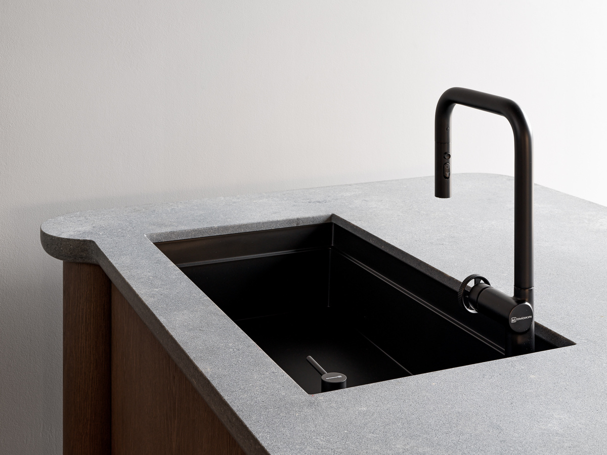 Подводя итог нашему обзору классической и современной кухни из московского шоурума, мы хотим обратить внимание на деталь, без которой невозможно представить ни один кухонный интерьер — мойку. В обеих кухнях установлены решения от японского производителя Omoikiri. В современной композиции использована чёрная мойка с монтажом под столешницу. Такой вариант особенно удобен для ухода, ведь крошки и капли воды легко убрать в один жест, а вместе со смесителем и дозатором в том же минималистичном стиле она поддерживает общую лаконичную эстетику. В классической кухне — совсем другой подход. Здесь установлена характерная для английских интерьеров керамическая мойка с выступающим передним фартуком (apron front). Этот тип мойки традиционно применялся в домах с массивными деревянными кухнями, подчёркивая основательность и долговечность. В нашем случае она дополнена смесителем и дозатором в классическом стиле, что делает ансамбль абсолютно цельным и завершённым. Такое внимание к деталям подтверждает