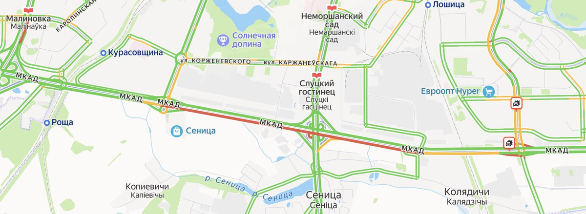 В выходные стало известно о том, что на пересечении МКАД, Игуменского тракта и улицы Бабушкина изменилась схема дорожного движения: здесь реализована дивергентная ромбовидная развязка, также известная как расходящаяся алмазная или двойная перекрестная алмазная развязка. Это первый подобный проект в Минске. Пока водители столкнулись с побочным эффектом. Наш читатель пожаловался на пробку, которая образовалась на съезде с кольцевой к Игуменскому тракту и улице Бабушкина. — Из-за новой разметки, которую нанесли в субботу, сегодня утром образовалась огромная пробка аж до слуцкой развязки. И многим стоять в очереди неохота: съезжают с первой полосы через сплошную линию, — говорит он. Ситуация в 09:00 — Я проехал туда и под мостом развернулся на внутреннюю сторону МКАД. Причина затора, скорее всего, из-за «короткого» светофора при повороте направо, на Колядичи. Там уже были сотрудники ГАИ, — отмечает читатель. — Это кошмар, такие пробки были там только при ДТП. Данные сервиса «Яндекс.Карты»