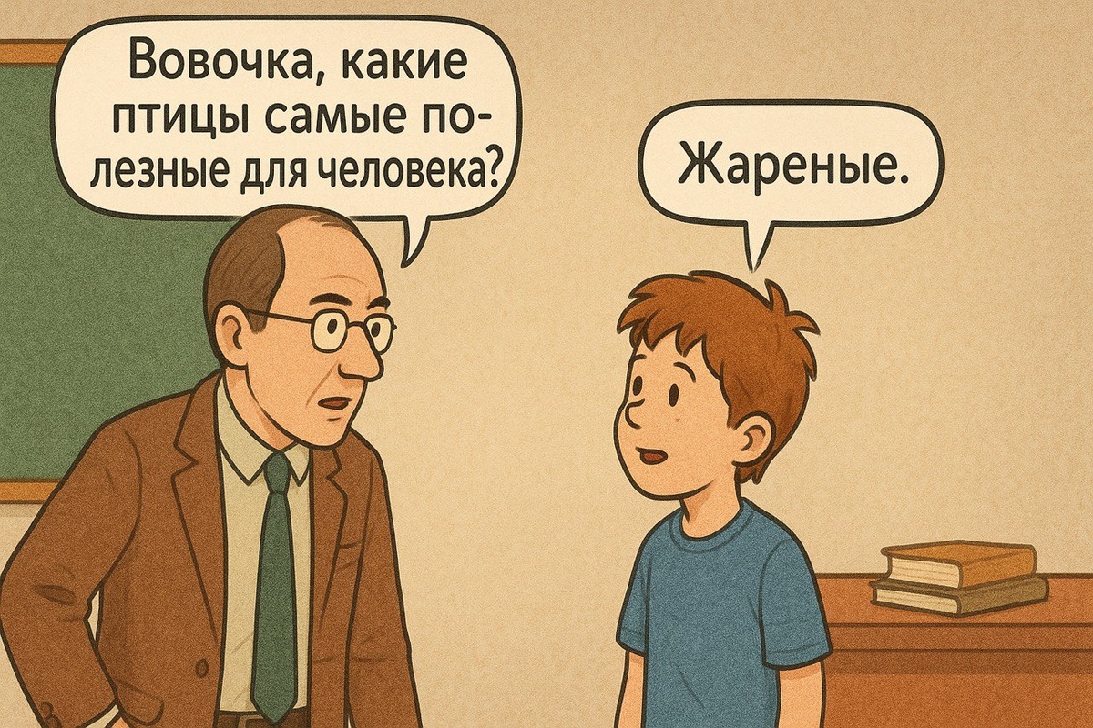 *** – Как называется подстреленный воробей? – Хворобушек? *** В кабинет к директору цирка входит человек: – Я хочу у вас выступать. – А что вы умеете? – Я умею изображать птиц. – В наше время этим никого не удивишь! – Не хотите, как хотите, – сказал незнакомец и вылетел в окно. *** – Вовочка, какие птицы самые полезные для человека? – Жареные. *** Две сороки смотрят на реактивный самолёт: – Почему эта птица так быстро летит? –А ты как полетишь, если у тебя хвост загорится? *** Учительница на уроке говорит: – Птицы очень полезны, о них надо заботиться. Вовочка, что хорошего ты сделал для птиц? – Я вчера свою рогатку ради них сломал! *** Папа объясняет сыну: – Почему аист стоит на одной ноге? – Разве не понятно? Если он поднимет вторую, то упадёт! *** Орёл спрашивает у Совы: – Сова, кто такая Жар-Птица? – Это курица, которая гриппом болеет. *** Орёл приходит в бар: – Мне как обычно – воздух и мышь. – Может, что-нибудь покрепче? – Нет, спасибо, я за крыльями. *** Трудовик спрашивает у уче