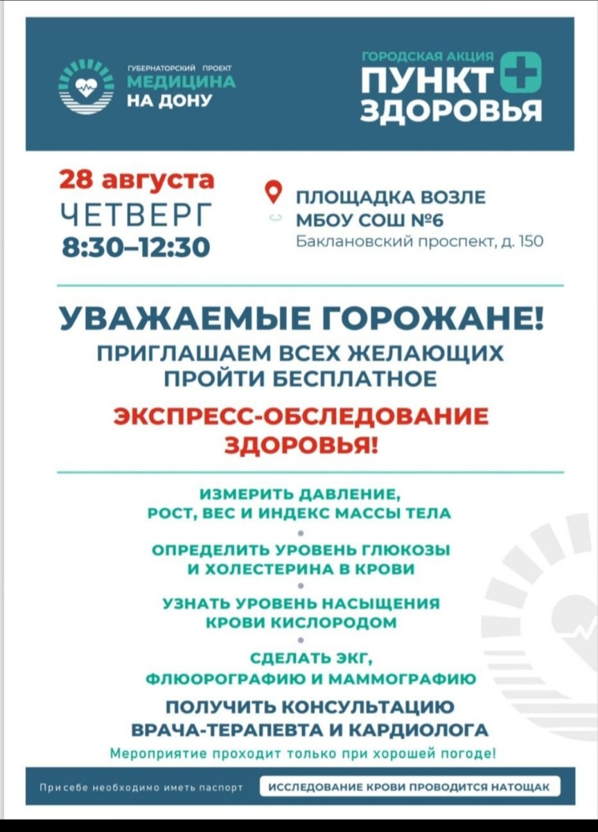 Жителям Черемушек предлагают проверить здоровье в шаговой доступности👨⚕Измерить вес, рост, давление, параметры насыщения крови кислородом и уровень холестерина жители Новочеркасска могут в рамках реализации губернаторского проекта «Медицина Дона». Десятый выезд специалистов состоится 28 августа. С 8:30 до 12:30 на площадке перед школой №6 (пр.Баклановский, 150) можно будет пройти экспресс-обследование при консультационной поддержке терапевта и кардиолога. 🩺Натощак можно будет сдать анализ крови, пройти ЭКГ и флюорографию. При себе иметь паспорт. Акция по проверке здоровья пройдет при хорошей погоде. Проверить состояние своего организма горожане смогут бесплатно. Проект пользуется популярностью. Участие в нем уже приняли более 900 человек.