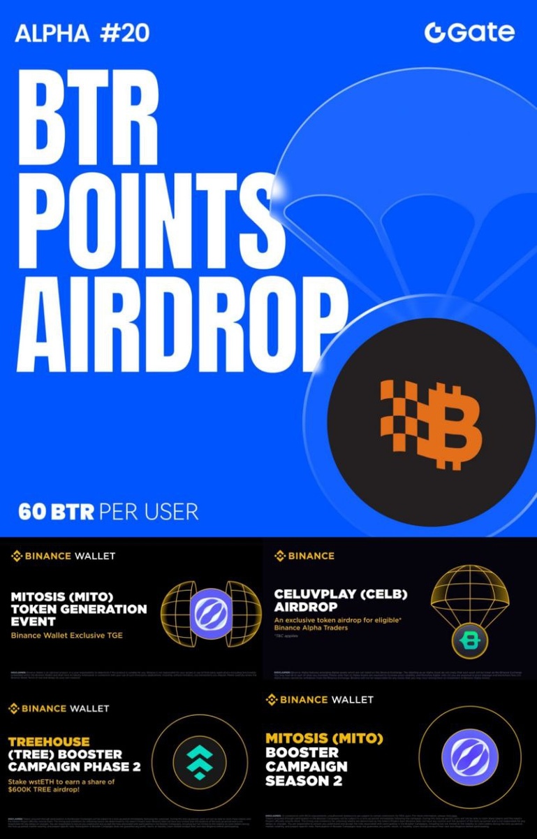 💰 Утро начинается с дропчика Если крутите Gate Alpha, то в 13:00 сможете забрать 60 токенов $BTR в формате FCFS. Для участия нужно иметь 125+ поинтов, снимут 12. Последние новости Binance Alpha: ▪️ Сегодня стартует Booster с TreehouseFi, где мы можем разделить 600 000$ в токенах $TREE. ▪️ Вчера начался 2-й сезон Mitosis с призовым фондом в $1,4млн в $MITO, где мы можем стейкать BNB или USDT в Simple Yield Mitosis Vault, чтобы получить свою долю. ▪️ 29.08 TGE $MITO (с 15:00 до 17:00) ▪️ 29.08 Airdrop CeluvPlay ($CELB) Также напомню, что сегодня листинг $BTR в 13:00 по Киеву. У многих есть аллокация после PRE-TGE на Binance Wallet, а также покупки на Coinlist, поэтому готовимся. ✈Bybit (https://partner.bybit.com/b/43818) | Chat | Admin