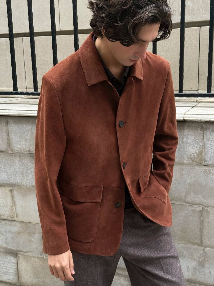 Пиджак из мягкой замши с бархатистым ворсом в теплом терракотовом оттенке. Носите с рубашкой или тонким трикотажем — он легко заменит куртку в прохладные дни