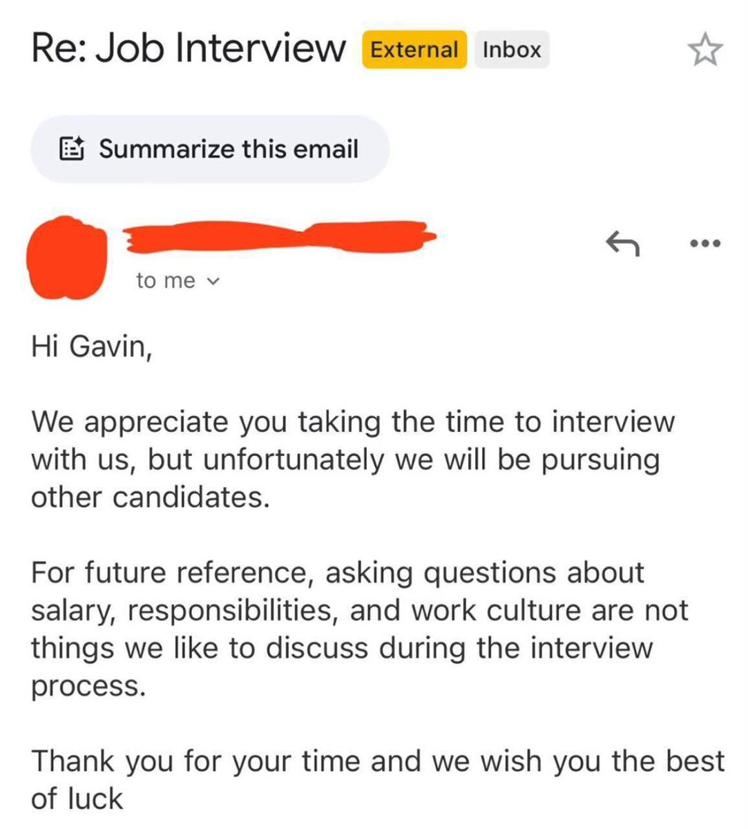 Парню отказали в работе, потому что он… спросил о зарплате. «Запомните на будущее: обсуждать зарплату, обязанности и корпоративную культуру на собеседовании — моветон. Нашей компании такие разговоры не по душе». Конечно, формулировка странная, и компания, скорее всего, рэд флаг, но предполагаю, что и соискатель вел переговоры о зарплате не совсем верно. Я сама прособеседовала сотни кандидатов, которые терялись на интервью, задавали вопросы не к месту и своими ответами только топили себя и свой опыт. А легко ли вам говорить о зарплате на интервью?