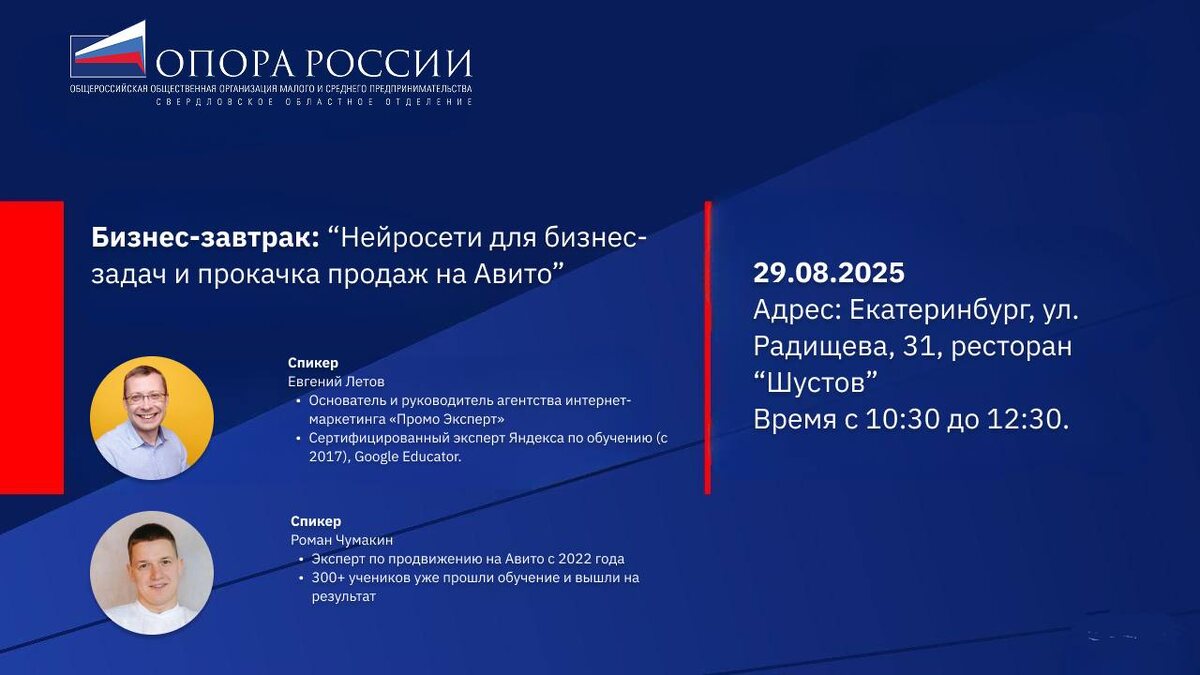 В пятницу, 29 августа приглашаю на бизнес-завтрак Свердловского областного отделения «ОПОРА РОССИИ» Разберем: ✅ Бизнес-промпты для бизнес-задач С помощью нейросетей достаём из головы, ускоряем, экономим и преодолеваем страх белого листа у предпринимателя. ✅ Как грамотно продвигать объявления, использовать платные инструменты, получать максимум заявок и не сливать бюджет в пустую. 🎤 Спикер — Евгений Летов • Основатель и руководитель агентства интернет-маркетинга «Промо Эксперт» • Преподаватель УрФУ, бизнес-школах «Высшая Экономическая Школа», «MaEd», «Академия Calltouch», а также для франчайзи компании «1С» • Сертифицированный эксперт Яндекса по обучению (с 2017), Google Educator 🎤 Спикер — Роман Чумакин • Эксперт по продвижению на Авито с 2022 года • Опыт работы в 50+ нишах: работа, транспорт, товары, услуги, недвижимость • 300+ учеников уже прошли обучение и вышли на результат ⸻ 29 августа 2025 в 10:30 Ресторан «Шустов» (летняя веранда), Радищева, 31 ❗️ Участие: бесплатно, об
