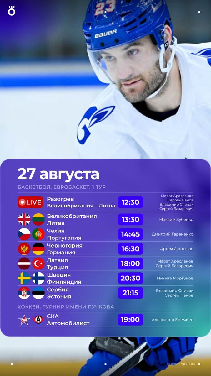 Старт Евробаскета, хоккейный турнир имени Пучкова, мультикаст ЛЧ и другие трансляции! 🤩