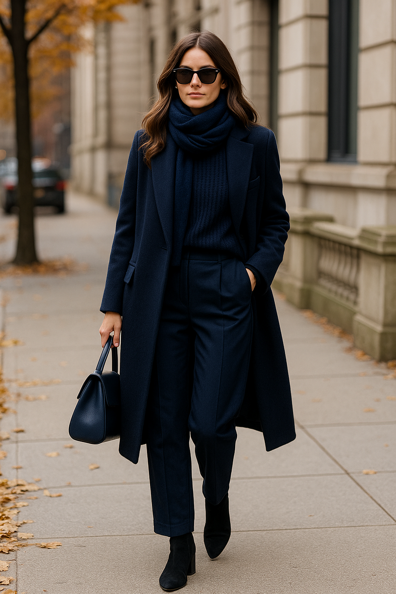 Тёмно-синий — идеальный баланс между строгостью чёрного и мягкостью более светлых оттенков. Он легко комбинируется с другими цветами: бежевым, серым, бордовым, зелёным и даже яркими акцентами вроде жёлтого или оранжевого. Этот цвет подходит как для монохромных образов, так и для многослойных комплектов. 1. Монохромный look