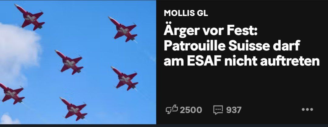 π " Π¨Π²Π΅ΠΉΡΠ°ΡΡΠΊΠΈΠΉ ΡΠ΅ΡΡΠΈΠ²Π°Π»Ρ Π±ΠΎΡΡΠ±Ρ ΠΈ Π°Π»ΡΠΏΠΈΠ½ΠΈΠ·ΠΌΠ° ΠΏΡΠΎΠΉΠ΄Π΅Ρ Π±Π΅Π· Π²ΡΡΡΡΠΏΠ»Π΅Π½ΠΈΠΉ Patrouille Suisse. ΠΠ΅ΡΠΎΠΏΡΠΈΡΡΠΈΠ΅ Π±ΡΠ»ΠΎ ΠΎΡΠΌΠ΅Π½Π΅Π½ΠΎ ΠΏΠΎ ΠΏΡΠΎΡΡΠ±Π΅ ΠΡΠ³ΠΊΠΎΠΌΠΈΡΠ΅ΡΠ° - ΠΏΡΠ΅Π΄ΠΏΠΎΠ»ΠΎΠΆΠΈΡΠ΅Π»ΡΠ½ΠΎ, ΠΏΠΎ ΡΠΎΠΎΠ±ΡΠ°ΠΆΠ΅Π½ΠΈΡΠΌ ΡΠΊΠΎΠ»ΠΎΠ³ΠΈΡΠ΅ΡΠΊΠΎΠΉ Π±Π΅Π·ΠΎΠΏΠ°ΡΠ½ΠΎΡΡΠΈ. Π Patrouille Suisse, ΠΈ Π±ΠΎΠ»Π΅Π»ΡΡΠΈΠΊΠΈ ΡΠ°Π·ΠΎΡΠ°ΡΠΎΠ²Π°Π½Ρ.