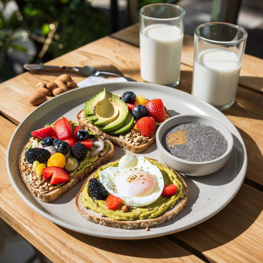 Простой и питательный завтрак, состоящий из ломтика цельнозернового хлеба, свежего авокадо и тонко нарезанного филе лосося. Авокадо поставляет полезные жиры, а лосось — качественный животный белок и омега-3 кислоты. Такой завтрак укрепляет сердце и сосуды, повышает иммунитет и снижает воспалительные процессы.