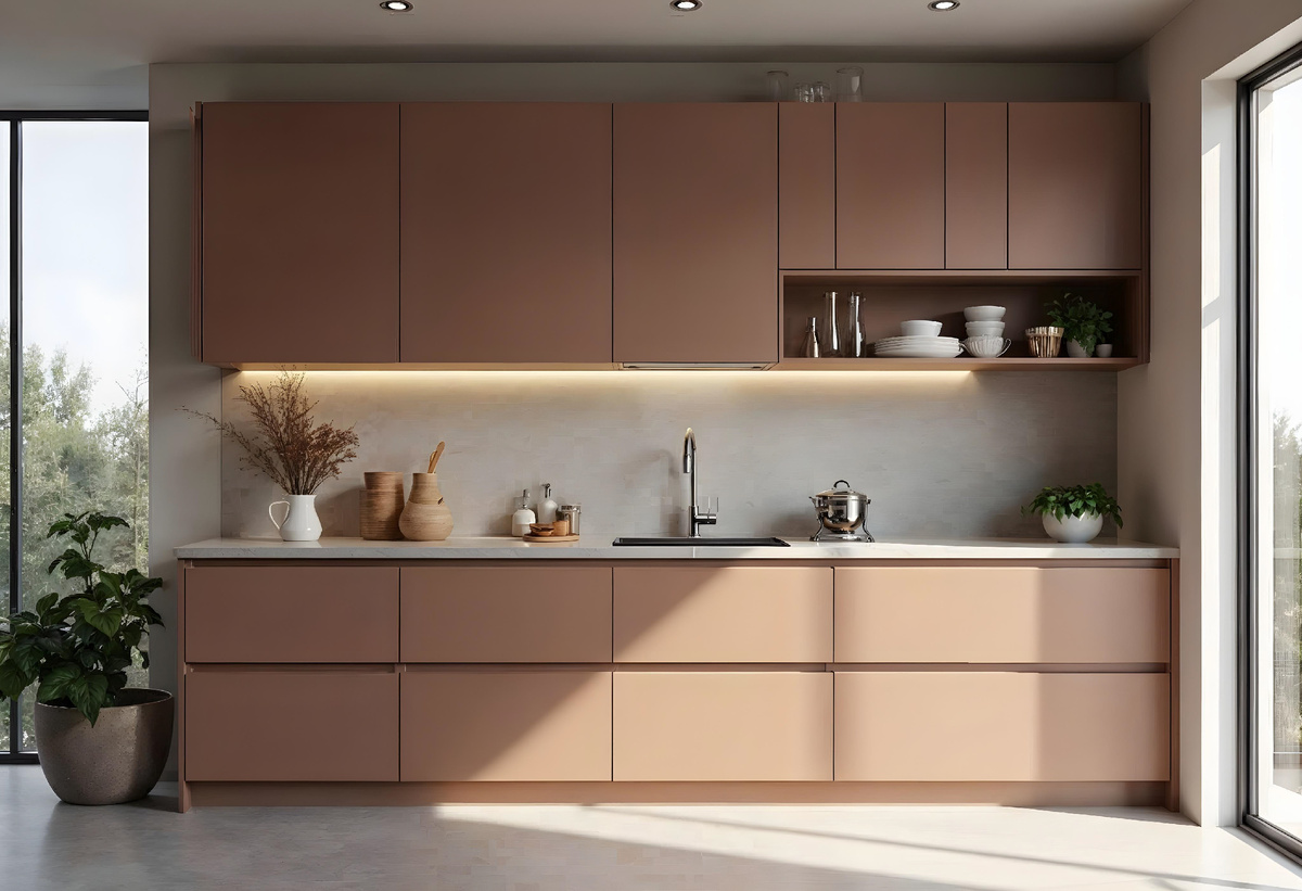 Терракота, Кирпичный, Ржавчина. Эти теплые, «земные» оттенки добавляют кухне не просто цвета, а тактильности и тепла. Они ассоциируются с ремеслом, ручной работой, натуральными материалами. Идеальны для создания акцентной зоны (остров, нижние тумбы, фартук), особенно в паре с оливковым или бежевым.