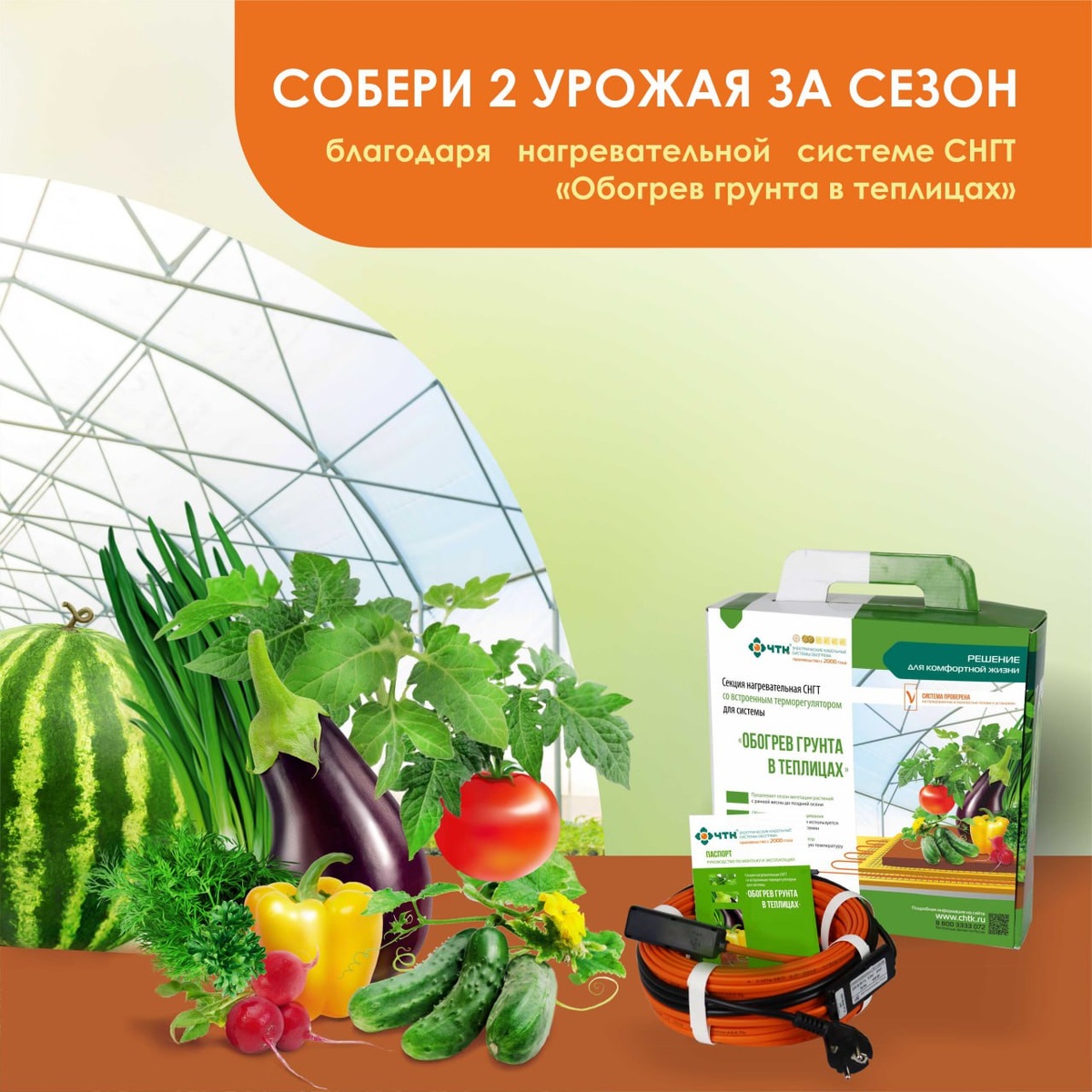 Готовь сани - летом, телегу зимой, а обогрев грунта в теплице сейчас – самое время! Собрали последний урожай этого сезона? Начинаем готовиться к следующему – ранневесеннему сезону! Всем, кто горит желанием получить ранний урожай, собрать не один урожай - продлить сезон растений с начала весны до конца осени, компания ЧТК рекомендует использовать в парниках секции со встроенным терморегулятором СНГТ. Благодаря встроенному терморегулятору, уже при температуре ниже +18°С грунт начинает прогреваться до +24°С и становится пригодным для выращивания раннего урожая в марте. Подогрев грунта в теплицах кабельной нагревательной секцией СНГТ поддерживать необходимый тепловой режим почвы вплоть до поздней осени. Нагревательные секции СНГТ укладываются только под грядки. Разработаны с оптимальной мощностью 100 Вт/кв. м., необходимой для поддержания и развития корневой системы растений, при условии рекомендаций по выбору и монтажу секций. Соберите два урожая на одной площади! Бесплатные звонки п