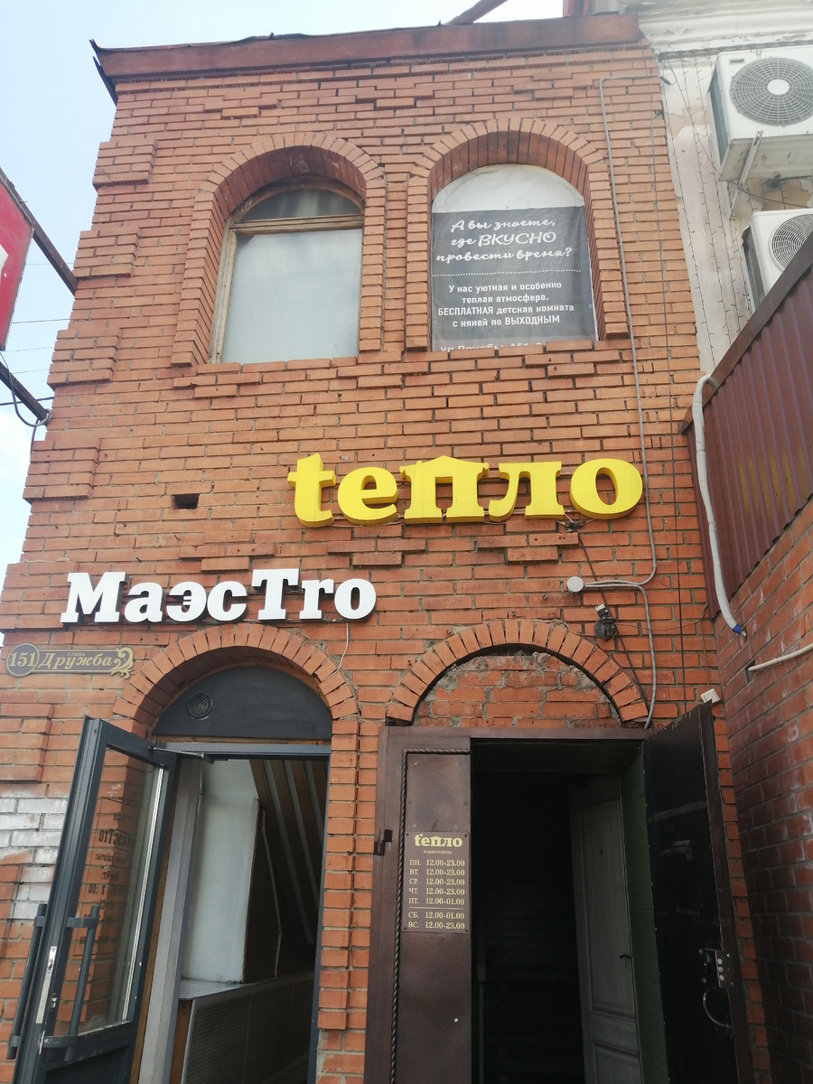 Красивое название у кафе - "Тепло", привлекательное, но отправились мы сюда, будучи в путешествии по Тыве и остановившись в Кызыле, не только из-за названия. Кафе и ресторанов в городе не очень много и у этого заведения были хорошие отзывы на «Яндексе». Проверим! Кафе находится на улице Дружбы, дом 151. Здание двухэтажное и может показаться, что старинное, но нет, оно было построено в 1959 году. Сама улочка не показалась мне уютной, шли по тротуарам с разбитым асфальтом. Рядышком находится городской ЦУМ. В здании, где расположено «Тепло», по соседству еще одно кафе – «МаэсТро», там мы не были. «Тепло» работает с 12 до 23 часов, в пятницу и субботу до часу ночи. Два зала, во втором - есть детская комната. У столов - мягкие диванчики, как я люблю. В обед действует меню «бизнес-ланча» по 415 рублей, но хоть мы и зашли на обед, мне в этот раз хочется роллов, надо же и в Тыве роллов хоть раз поесть. Роллы «Тори пицца» (480 рублей) очень понравились мужу, мне же больше «Филадельфия с