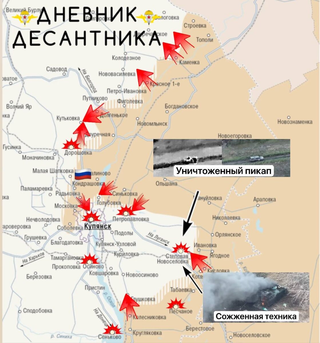 🪂 Купянское направление. Наши войска продолжают наступать у северных окраин Купянска, Петропавловки, также в районе Степовой Новоселки. ▫️На северном фланге бойцы ВС РФ продвинулись у Каменки и расширили контроль территории на 20 км2 в направлении Строевки, зачистив участок до Тополей. ▫️ Силами бойцов из 25-й и 27-й бригад освобождено село Кондрашовка. В районе Степовой Новосёлки бойцы 352-го продолжают выбивать врага, ФПВ-расчеты ВС РФ уничтожают живую силу и технику противника, для предотвращения перемещения к нашим позициям. Также работаем по тыловым важным объектам противника, ВКС РФ нанесли серию ударов по огневым и укреплённым районам в южной и западной частях Купянска. ▫️ Дневник Десантника