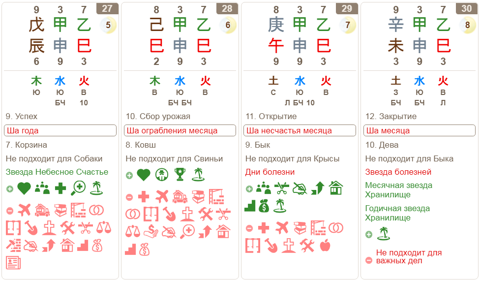 Сегодня можно зайти на любой калькулятор, ткнуть курсором мышки в нужный день, посмотреть на иконки и выбрать благоприятный день для своей задачи (активности).