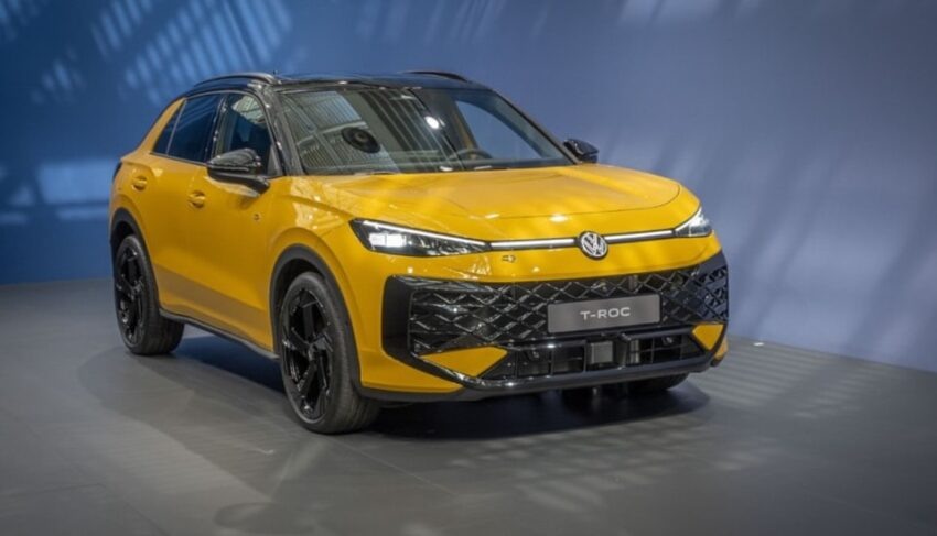 На изображениях совершенно новый Volkswagen T-Roc второго поколения 2025 года во всей красе в топовой комплектации R-Line с ярким жёлтым цветом кузова и контрастными чёрными деталями. Такими как решётка радиатора, передние стойки и крыша, а также пятиспицевые колёсные диски в стиле турбины. Мы также заметили другой дизайн легкосплавных дисков на малиновом экземпляре.