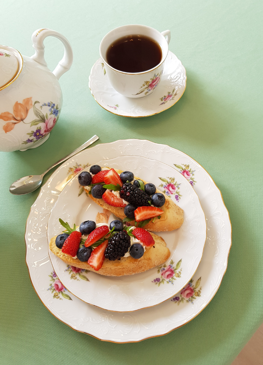 Доброе утро, дорогие друзья! Сегодня я представляю вашему вниманию рецепт брускетты уходящего лета. В Сибири во всю ощущается зима, трава покрыта изморозью и снегом, но в соседних странах все еще собирают урожаи последних ягод, и это позволяет насладиться ароматом лета. Для приготовления 2 порций нам понадобятся: 4 ломтика багета, 100 грамм творожного сыра, 4 клубники, 4 ежевики, 40 грамм голубики, 10 грамм рукколы, оливковое масло, черный перец, 1 зубчик чеснока, соль. Приготовление: ломтики багета подсушить на электрогриле. Творожный сыр выложить в кондитерский мешок с насадкой. У клубники удалить плодоножки и разрезать ягоды на 4 части. Подсушенные кусочки багета натереть чесноком с одной стороны. Полить оливковым маслом. Распределить оливковое масло по кусочкам багета с помощью кулинарной кисти, посыпать свежемолотым перцем и солью. Выдавить на хлеб творожный сыр. Разложить листья рукколы по брускеттам. Украсить брускетты ягодами клубники, ежевики и голубики. Благодаря во