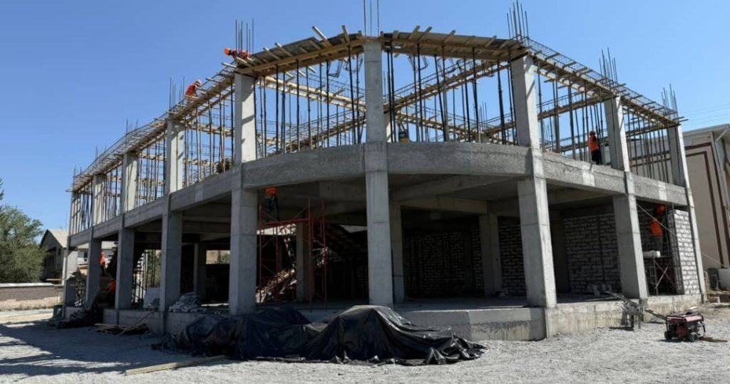 🧱 Учурда имараттын жер төлөсүнүн темир-бетон дубалдары тургузулуп, биринчи кабаттын колонналарынын бетондолушу жүрүп жатат.