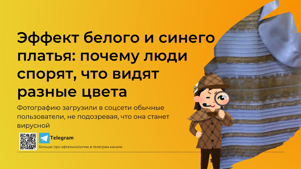 В феврале 2015 года интернет буквально взорвался из-за одной фотографии платья. Одни клялись, что оно белое с золотым, другие так же уверенно говорили: синее с чёрным. Миллионы людей спорили, шли жаркие дискуссии, а психологи и офтальмологи получили уникальный шанс объяснить, как работает наше зрение. Фотографию загрузили в соцсети обычные пользователи, не подозревая, что она станет вирусной. Снимок сделали при сложном освещении, из-за чего камера зафиксировала странные оттенки. Дальше началось самое интересное: разные люди видели совершенно разные цвета. Одни утверждали: "Как можно не заметить золотистые полосы?", другие отвечали: "Какие золотые, это же чёрное!". Наш глаз сам по себе не "видит" цвета - он улавливает свет разных длин волн. Окончательное решение о том, какой цвет вы видите, принимает мозг. Главный фактор - освещение. Когда мы смотрим на предмет, мозг пытается "угадать", какой свет падает на него, и корректирует картинку. · Если мозг думает, что платье освещено холодным