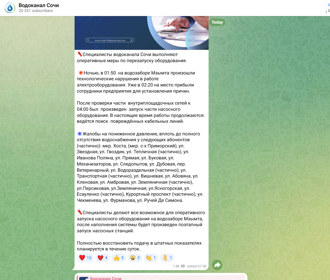 Но среда, 27 августа стал настоящим апогеем коммунальных аварий за последнюю неделю. Ночью на водозаборе Мзымта произошли технологические нарушения в работе электрооборудования, и утром воды не обнаружили у себя жители целых районах – Адлерского, Хосты, Мацесты, Быт