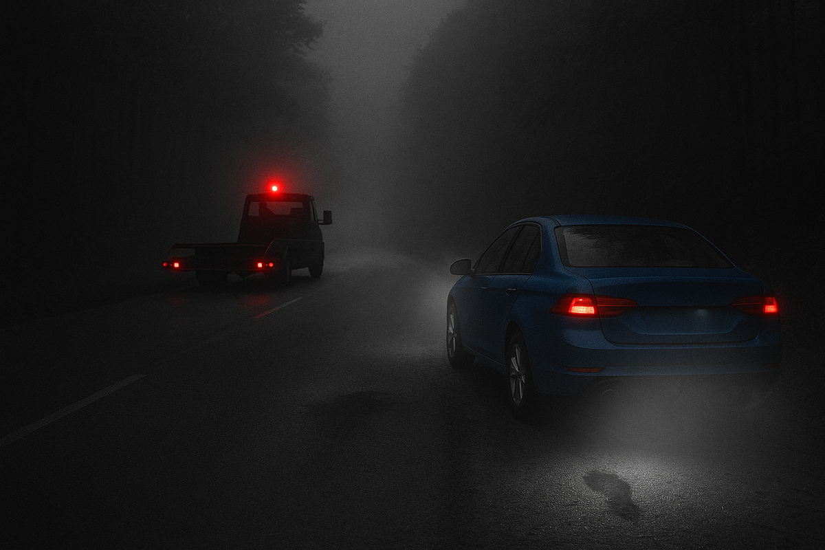 Я пошёл к эвакуатору, стараясь выглядеть спокойно, хотя внутри всё кричало «беги». Туман стал плотнее, и свет фар «Хонды» выхватывал лишь небольшие островки.