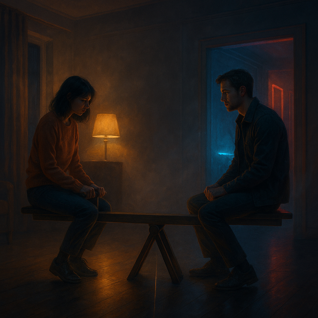 Он смотрит в зеркало и слышит только себя. Ей страшно замолчать — вдруг исчезнет. Исцеление начинается там, где каждый учится: смотреть не в зеркало, а в глаза; говорить своим голосом и выдерживать паузу.
