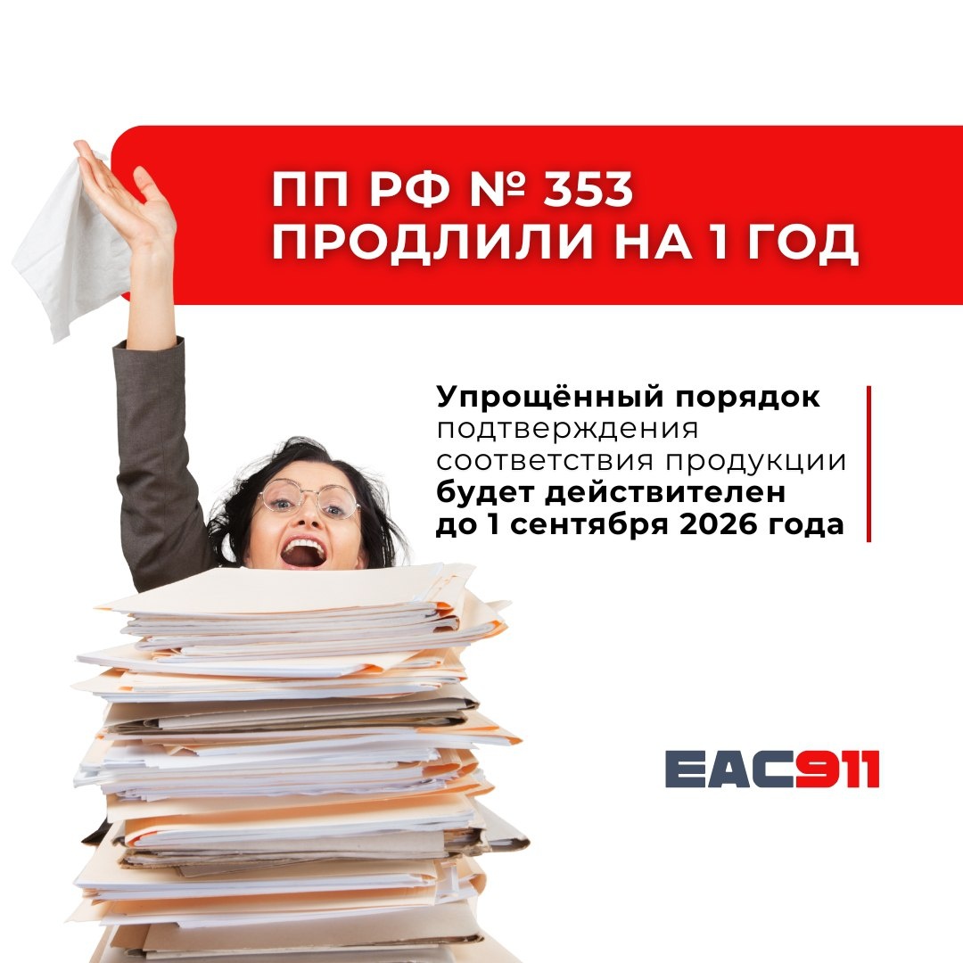 Отличная новость для бизнеса! ❗️ Правительство продлило упрощённый порядок подтверждения соответствия продукции ещё на год — до 1 сентября 2026 года. Действие продления закреплено в постановлении №1277 от 26 августа 2025 года, которое обновляет постановление №353 от 12 марта 2022 года. Польза очевидна: меньше бюрократии, быстрый вывод продукции на рынок и возможность поддерживать бизнес в условиях санкций. ⚠️ Год на упрощёнку — не на отпуск! Используем время с умом, продолжаем работать по упрощённой схеме и заранее готовимся к будущим обязательствам. ✅ Канал | Сайт | Поддержка