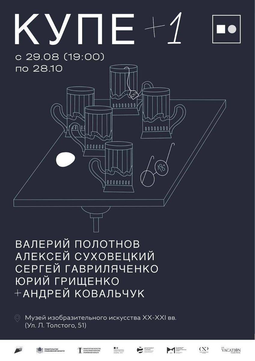 Союз художников России представит в Ульяновске выставку «КУПЕ+1» 🗓️ выставка откроется 29 августа в 19:00 📍в Музее изобразительного искусства XX-XXI вв. (Льва Толстого,51) «КУПЕ+1» — выставка известных московских художников Валерия Полотнова, Алексея Суховецкого, Сергея Гавриляченко, Юрия Грищенко, Андрея Ковальчука, художников одного времени, одного поколения. «КУПЕ+1» — пространство взаимодействия различных по своему внутреннему складу индивидуальностей, пространство внешнее и пространство внутреннее. При общем единстве разнообразных приёмов и отношения к жизни творчество каждого художника по-своему глубокомысленно и серьёзно, наполнено неповторимым образным строем. Мастера, подчас иронично смотрящие на себя со стороны, но воспевающие в своём творчестве гармонично сочетающиеся между собой просветлённость и трагедию, монументальность мысли и лёгкость в подаче материала, хмурость пасмурного дня и воздушную светоносную прозрачность, приглашают своего зрителя на выставку «Купе+1».