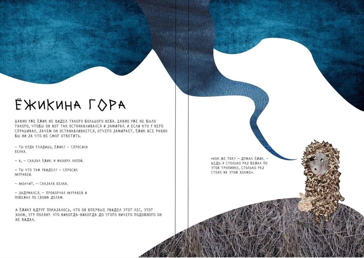 По вечерам Ёжик ходил к Медвежонку в гости считать звёзды. Они усаживались на брёвнышке и, прихлёбывая чай, смотрели на звездное небо… «Ёжик в тумане» - сказочная повесть Сергея Козлова - вдохновлять студентов на новые творческие решения. Представляем креативную работу Екатерины Чирковой, выпускницы Колледжа креативных индустрий и предпринимательства Университета сервиса. Дизайн разворотов книги «Ежик в тумане» наша студентка выполнила во время обучения по дисциплине «Финальная сборка дизайн макетов и подготовка их к печати». Проект изначально возник как задание по курсу «Информационный дизайн и медиа». Моя цель заключалась в том, чтобы студенты смогли испытать себя в определенной технике иллюстрации книг. Катя подошла к задаче творчески, объединив элементы коллажа и графической верстки. Использование ограниченного цветового спектра позволило ей добиться нужного визуального эффекта. Эта работа наглядно демонстрирует возможности творческого подхода к выполнению проектов, когда автор