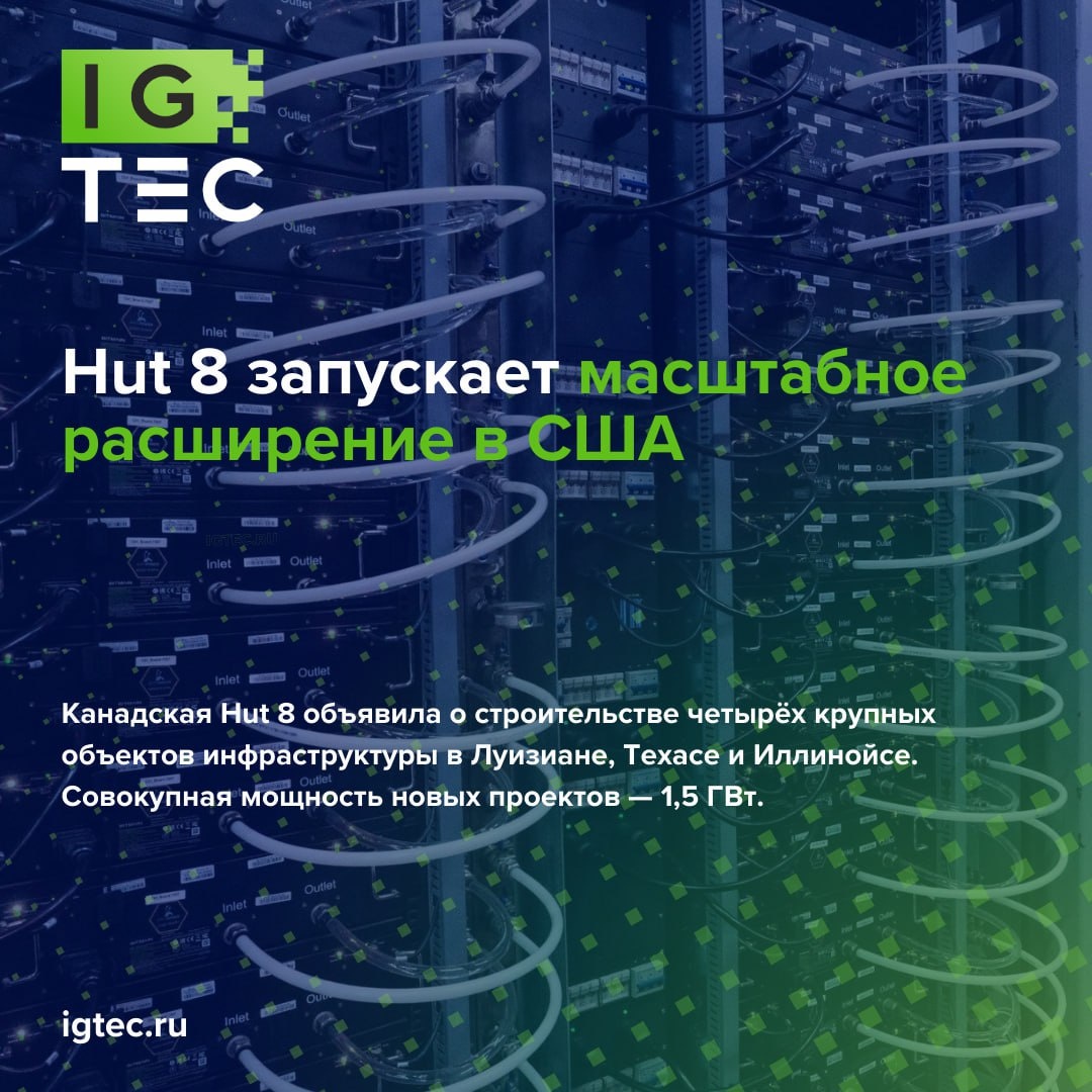 🚀 Hut 8 запускает масштабное расширение в США Канадская Hut 8 объявила о строительстве четырёх крупных объектов инфраструктуры в Луизиане, Техасе и Иллинойсе. Совокупная мощность новых проектов — 1,5 ГВт. 🔋После запуска общая управляемая мощность компании превысит 2,5 ГВт на 19 площадках. В перспективе — свыше 10 ГВт. 📊 Для финансирования Hut 8 привлекла: 🔹$200 млн кредитной линии от Two Prime 🔹$130 млн от Coinbase Общий объём свежего капитала — $330 млн. 💰Кроме того, компания располагает ликвидностью до $2,4 млрд, включая свыше 10 000 BTC (≈ $1,2 млрд). 🏗Hut 8 активно уходит за пределы классического биткоин-майнинга и строит инфраструктуру для высокопроизводительных вычислений и энергоёмких технологий. 🔍 Тренд очевиден: крупнейшие игроки формируют не просто майнинговые ЦОДы, а полноценные энергетические и цифровые хабы. Наш сайт / FAQ-бот / О компании