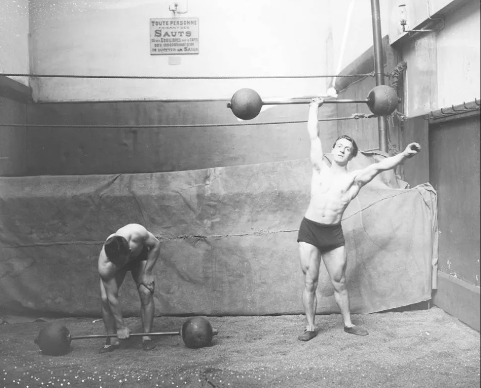 Из истории тяжелой атлетики: На первых двух фото демонстрация рывка штанги одной рукой французскими тяжелоатлетами (1922 год) и демонстрация рывка штанги одной рукой в пособии СССР "Специальные упражнения для тяжелоатлетов" (1971).В то время как после Игр 1924 года из Олимпийских соревнований были исключены подъем одной рукой, их практику сохранили в СССР.