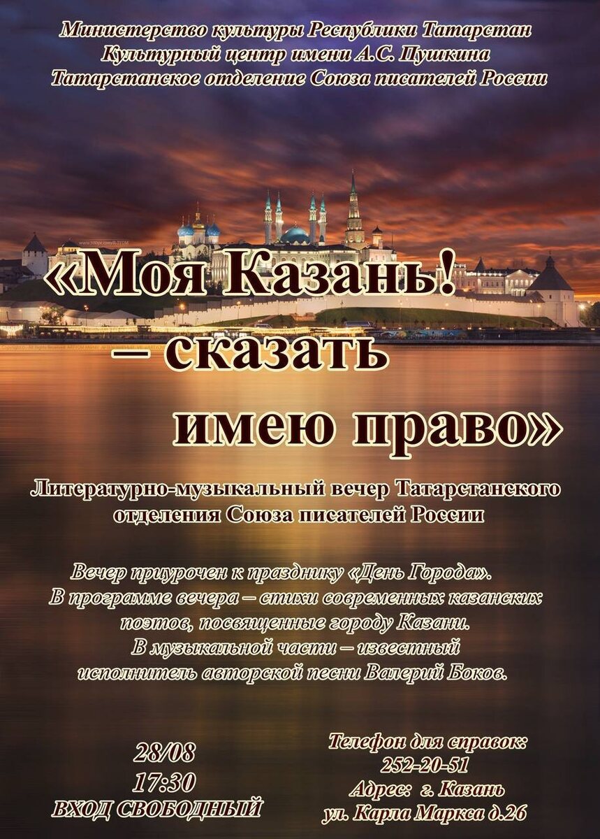 В программе — стихи современных казанских поэтов о нашем городе и авторские песни Валерия Бокова — известного российского автора-исполнителя, чьи произведения всегда находят живой отклик в сердцах слушателей.