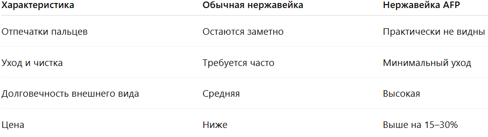 Это та же нержавейка, но с нанесённым прозрачным или тонированным полимерным покрытием. Оно создаёт тончайший защитный слой, который уменьшает видимость отпечатков и облегчает уход. Преимущества AFP: Преимущества в эксплуатации: Если для вас важен идеальный внешний вид при минимальном уходе, то стоит выбрать нержавейку с покрытием Antifingerprint.