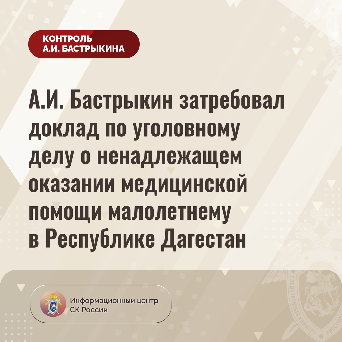 А.И. Бастрыкин затребовал доклад по уголовному делу о ненадлежащем оказании медицинской помощи малолетнему в Республике Дагестан