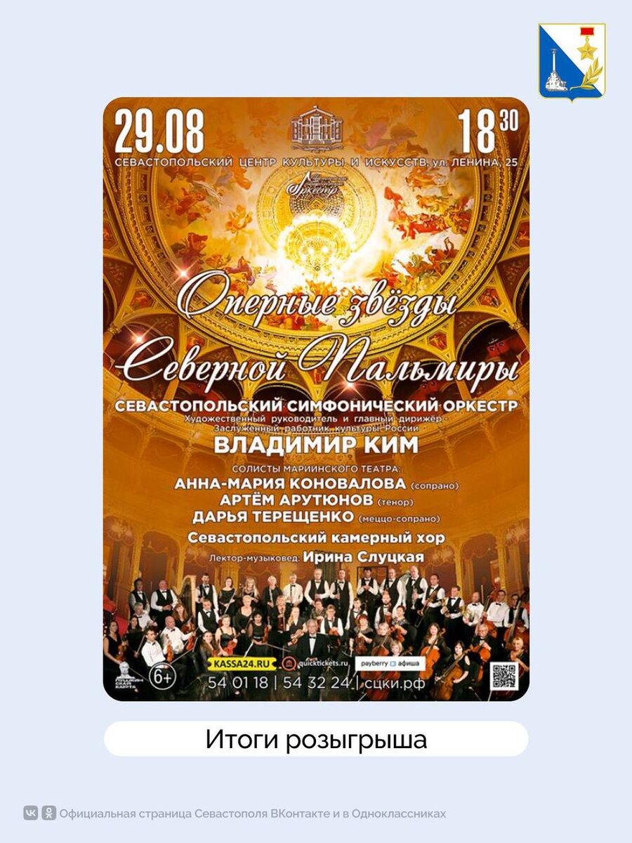 Подводим итоги розыгрыша! Дарим два билета на грандиозный концерт «Оперные звезды Северной Пальмиры» в исполнении Севастопольского симфонического оркестра и звёздных солистов Мариинского театра 29 августа @KiselevaV7. Благодарим всех за участие! Следите за новостями — впереди еще много интересных мероприятий. Подписывайтесь на наш канал в МАХ