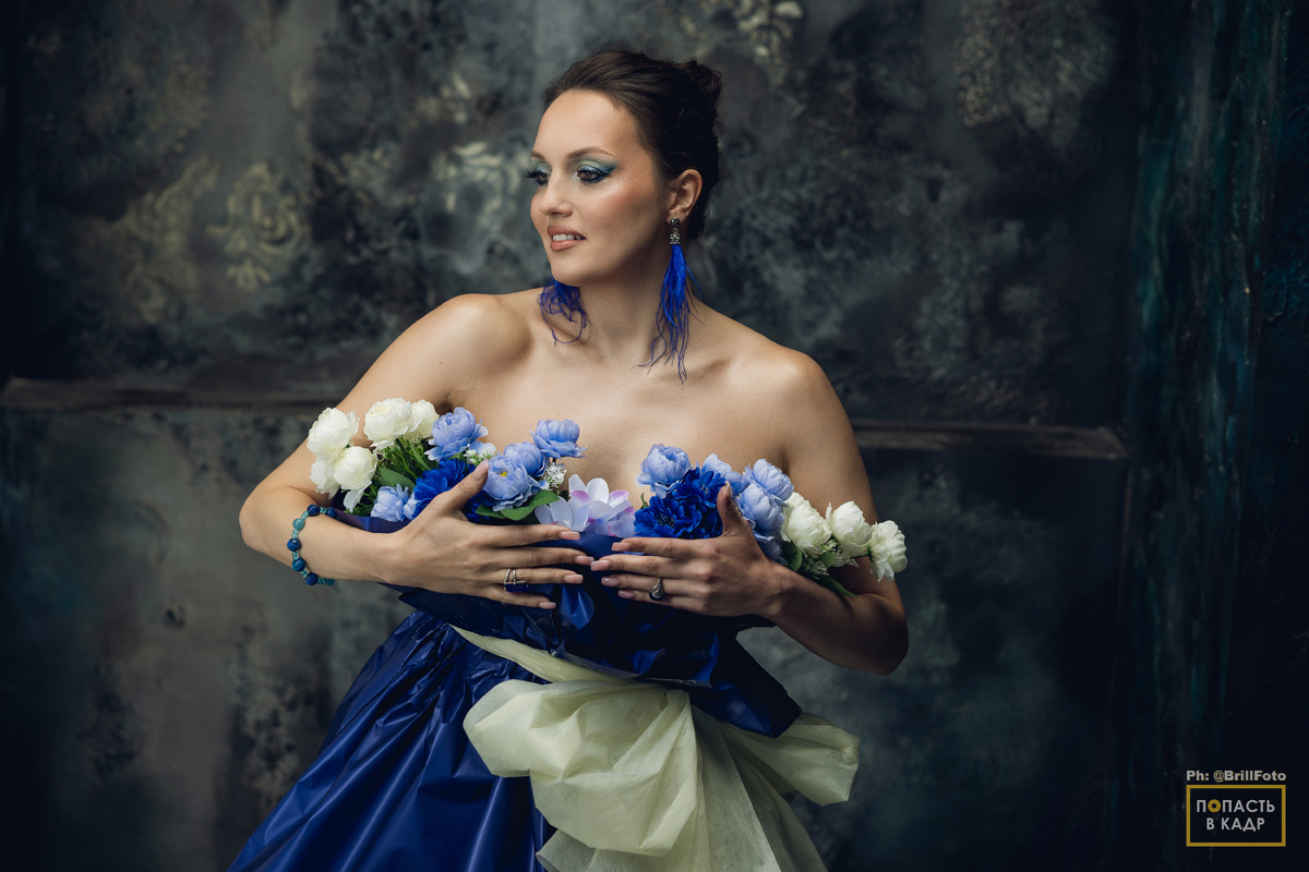 - Сценическая серия 2: «Шелковая ночь» — глубокие оттенки, темная студия, яркие акценты на букет и глаза модели.