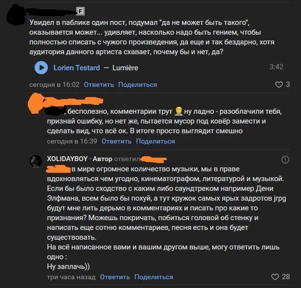 «Кружок самых ярых ******** JRPG»: российского музыканта Xolidayboy обвинили в плагиате на композицию «Lumière» для Clair Obscur: Expedition 33. Месяц назад вышел альбом исполнителя, в котором песня «Между строчек» подозрительно похожа по звучанию на трек из игры Sandfall Interactive, однако Xolidayboy свою вину не признал и предложил «поплакать обиженкам». Некоторые пользователи отправили жалобу в поддержку «Яндекс Музыки», однако сервис может заблокировать песню только по запросу правообладателя. При возможности запретить этот трек смогут только авторы, если у них будет желание разбираться в этом. #индустрия@InYouEyes