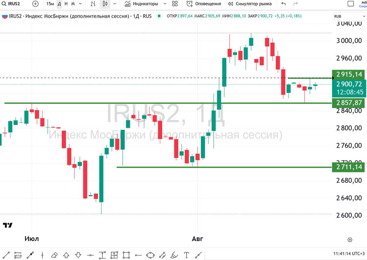 Друзья, добрый день! Я в отпуске, но буду стараться продолжать делать обзоры рынка, только в таком мини-текстовом формате. Индекс МосБиржи смог стабилизироваться после коррекции от 3000 пунктов. Если останется выше 2850 и закрепится выше 2915, то можно предположить, что растущий тренд, сформированный от середины июля, сохранился. Я сохраню основные позиции в портфеле, если рост продолжится, буду постепенно искать новые идеи. Фьючерсы на нефть вчера продолжили падать, и я закрыл свой лонг, передвигал стоп выше покупок. Я указывал, что нефть может служить сейчас косвенным индикатором эскалации и деэскалации геополитики, на фоне ее снижения вернулся к покупкам российского рынка акций. В целом пока на российском рынке акций можно сказать затишье, в рамках растущего тренда, ждем новых событий в «переговорном треке». В понедельник я увеличил позицию по Роснефти $ROSN, переставил стоп вплотную, на 251,4. Эта идея еще актуальна для новых покупок. Теперь присматриваюсь к новой покупке по Газпро