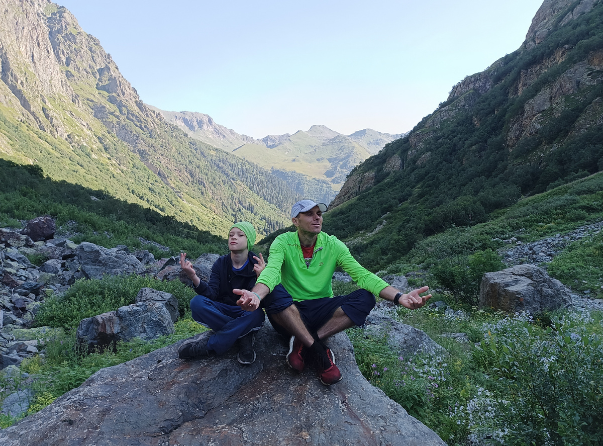 Ночевали в одежде. Как раз тот случай, когда тащишь куртку, чтоб один раз одеть. На высоте, между двух рек, воздух ледяной ночью. И с восходом солнца тепло приходит не сразу. Встали рано, чтоб успеть отобедать на перевале. Где должен быть кордон и стол, и возможность приготовить, так нам казалось... Красивые виды гор открываются, когда ты начинаешь подниматься. И страх сковывает, когда ты смотришь с узенькой тропинки вниз на безумный поток реки. Одно неловкое движение...и поймать человека очень сложно...река унесет далеко. Я налегала на палки. Несколько раз они спасали меня от падения. Ползем вверх по серпантину. Опять вверх и все петляем. Воздух уже начинает душить. Жарко. Раздеваемся. Попадаем в лощинку. Я вдыхаю аромат цветов. Это так божественно. Настолько растения могут впечатлять и поднимать настроение. Я пытаюсь их обнять и запечатлеть в памяти. Мальчики спокойно сидят на своих рюкзаках, ждут пока я соприкоснусь душой и руками с разными цветочками. Пока я как бабочка "облетаю" в