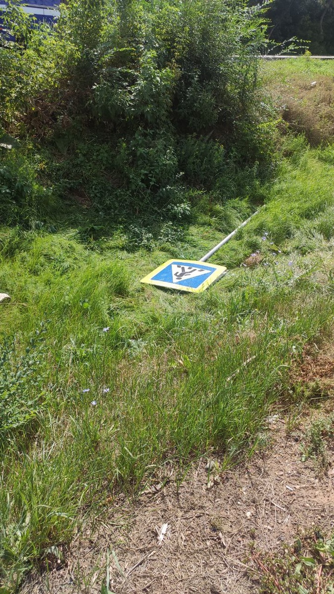 На улице Автомобилистов. Выкинули знак в канаву. А ведь скоро 1 сентября. Дети в школу ходят по этому переходу