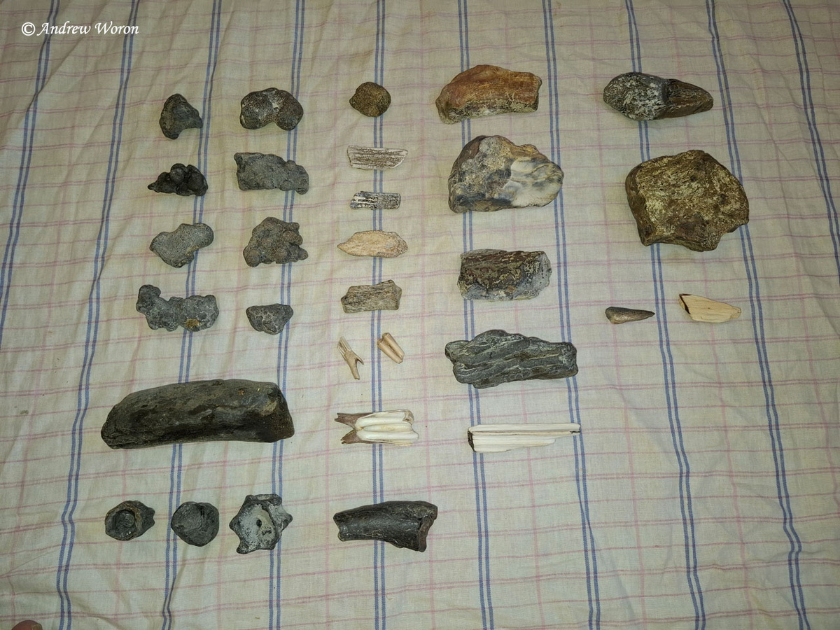Готов представить вам, дорогие мои читатели, находки из последней экспедиции на берега Цимлянского водохранилища. Здесь немного, но есть и эксклюзивы, и я им очень доволен. Хотя времени не хватило, чтобы найти больше. А там еще есть… Общее фото моих находок сразу по прибытии домой. Еще не мытые и не разобранные – просто разложенные для общего обозрения. Первая находка с побережья – фрагмент окаменелой древесины с фосфоритовым замещением. Там на берегу вообще много фосфорита из Эоценового периода К сожалению, это почти все фрагменты древесины. В этот раз не нашлось крупных или больших, но и это не плохо. Пожалуй, вот он самый крупный фрагмент дерева. Довольно увесистый фрагмент ребра кита Эоцета. Теперь он на полке, рядом с фрагментом позвонка. Окаменелые морские губки, целых восемь штук. Ждут, чтобы пополнить чью-то коллекцию. Интересующиеся могу написать мне. Четыре небольших фрагмента слоновьих зубов. К сожалению, мне не повезло, как напарнику – он нашел довольно большой кусок зуба (