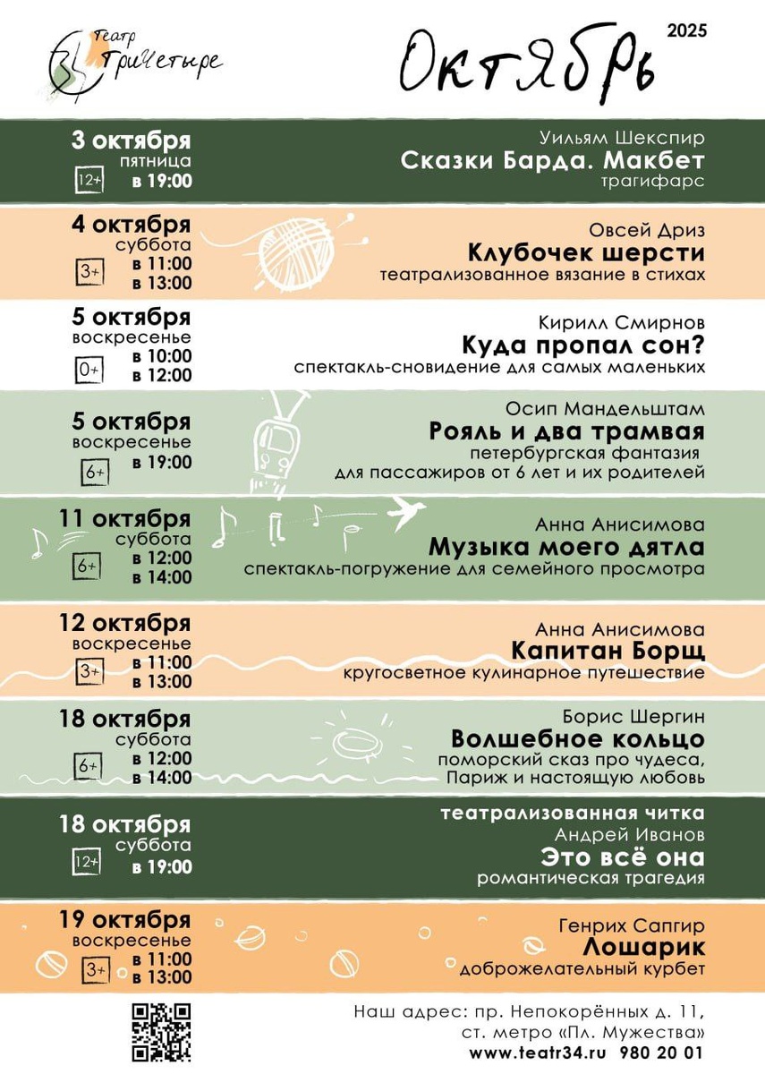 Билеты на октябрь и начало ноября уже в продаже🍁 ⭐Для самых ранних пташек, которые в августе уже думают про октябрь! ⭐Для тех, кто любит всё планировать заранее! ⭐Для тех, кто очень любит театр! Дарим вам, дорогие зрители, промокод ОКТЯБРЬ на все (сюрприз!) октябрьские спектакли и те, что состоятся в начале ноября. Тут и любимые "Сказки про мам", и очень правдивое "Волшебное кольцо", и могущественная "Колдунья с улицы Муфтар". Так что спешите за билетами! http://teatr34.ru/