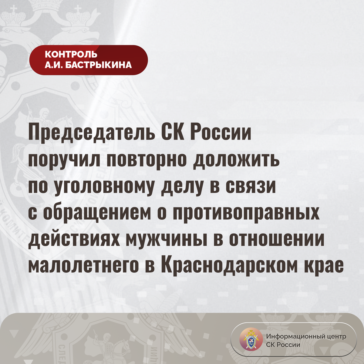 Председатель СК России поручил повторно доложить по уголовному делу в связи с обращением о противоправных действиях мужчины в отношении малолетнего в Краснодарском крае В Информационный центр СК России обратилась жительница города Новороссийска Краснодарского края, выразив несогласие с ходом установления обстоятельств похищения ее четырехлетнего сына. В августе 2022 года отец ребенка, являющийся гражданином Турецкой Республики, при встрече с женщиной подсыпал ей снотворный лекарственный препарат, после чего забрал мальчика и скрылся в неизвестном направлении. Обращение в органы внутренних дел результатов не принесло. Мужчина смог беспрепятственно вывезти малолетнего за пределы Российской Федерации. Мер к возращению ребенка матери не принимается. В СУ СК России по Краснодарскому краю по данному факту расследуется уголовное дело, по которому ранее А.И. Бастрыкин поручал представить доклад. Председатель Следственного комитета Российской Федерации Александр Иванович Бастрыкин поручил руко