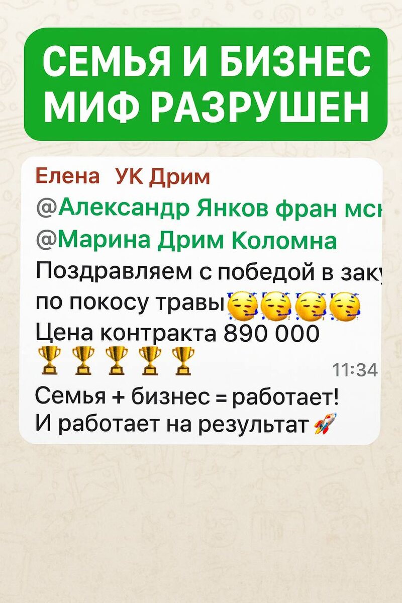 «Говорят, бизнес и семья несовместимы. Но наши партнёры из Коломны каждый день доказывают обратное. Уже год супруги развивают бизнес вместе с Dream Group. Начав с химчистки, клининга и прачечной, они взялись за новые направления: выиграли тендер по покосу травы и обслуживают театр в своём городе. С минимальными вложениями они открыли прачечную в Подмосковье, которая обслуживает детские сады. Только за последние месяцы мы помогли им заключить контрактов более чем на 5 миллионов рублей. А теперь — новый шаг: совместно рассчитываем финансовые модели, чтобы запустить сеть мини-прачечных по региону. Особенно ценно то, что их бизнес держится на крепкой семейной поддержке. Вместе они не только развиваются, но и помогают другим: пара активно участвует в программах реабилитации людей в трудных жизненных ситуациях, курируют реб. центр. Dream Group предоставляет рабочие места тем, кто ищет шанс на новое начало. Недавно они выиграли очередной аукцион — и получат минимум 35% чистой прибыли. Э