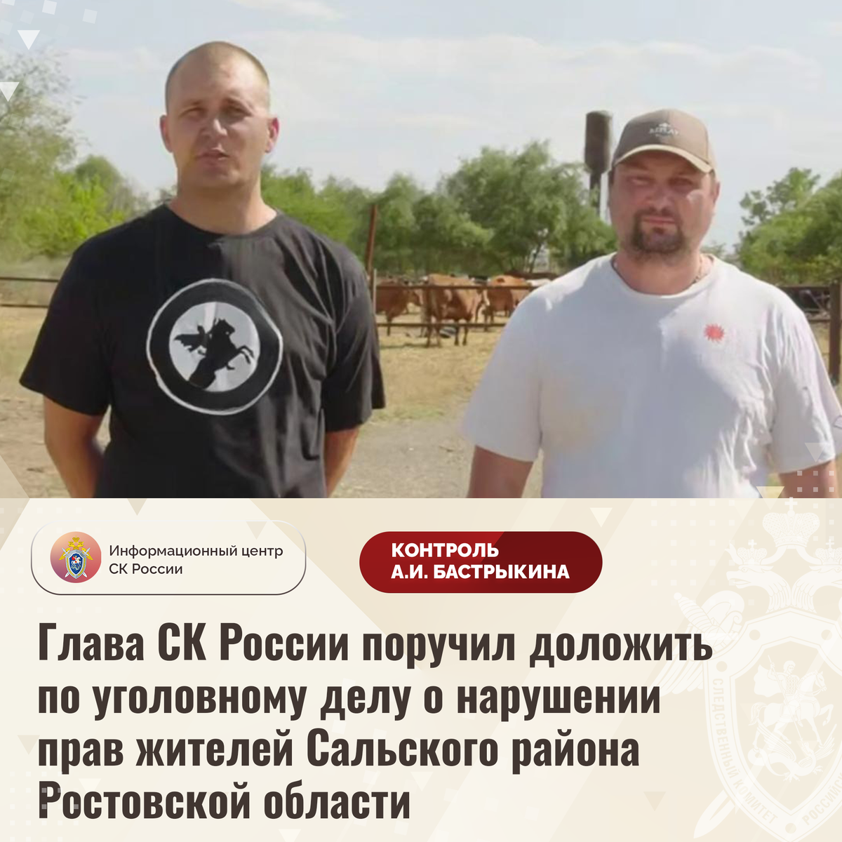 Глава СК России поручил доложить по уголовному делу о нарушении прав жителей Сальского района Ростовской области В телеграм-канале размещено видеообращение к Председателю СК России А.И. Бастрыкину жителей Сальского района Ростовской области о несогласии с ходом установления обстоятельств нарушения их прав. На протяжении нескольких лет местный предприниматель оказывает силовое и административное давление на фермеров с целью незаконного завладения их земельными участками и имуществом. Многочисленные обращения в различные инстанции результатов не принесли, содействие пострадавшим в разрешении ситуации не оказано. Отмечается затяжной характер расследования уголовного дела, никто к ответственности не привлечен. Ранее указанная ситуация освещалась в СМИ. А.И. Бастрыкин ставил ее на контроль в центральном аппарате ведомства. В СУ СК России по Ростовской области расследуется уголовное дело. Председатель Следственного комитета Российской Федерации Александр Иванович Бастрыкин поручил руководит