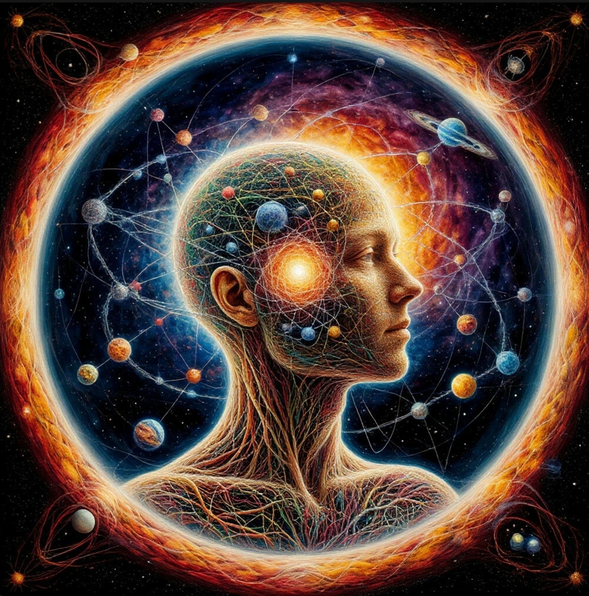 Каждое дрожание атомов в моем теле, каждый оборот электрона по своей орбите в них, каждое мое движение и каждая мельчайшая мыслишка - оставляют свой отпечаток в Мире. Я навсегда останусь в нем и вместе с ним буду вечно двигаться в будущее. Я словно нить из плоти, которая свивается в начале из ворсинок и распускается на волокна в итоге, нить намотанная на миллиарды километров космоса на пути полета Солнца и Земли. Я - сама ткань гобелена жизни. Я украшаю ее своими цветами и извивами. Я не исчезну отсюда, я не приходил сюда. Я на своем месте. Мы все вшиты в прекрасное полотно Вселенной...