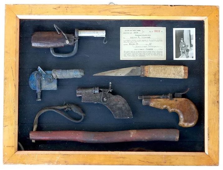 Содержание в самых строгих и контролируемых условиях, которые только могло предоставить общество, иногда не мешает заключëнным изготавливать потенциально смертоносное огнестрельное оружие из безобидных и бесполезных, на первый взгляд, кусков металлолома. Экспозиция однозарядных пистолетов, заточки и свинцовой дубинки, конфискованных в нью-йоркской тюрьме в 1950 году. Самопалы, представленные выше, были конфискованы у заключенных в тюрьме штата Миссисипи. A был обнаружен у заключенного во время обычной облавы. У B ствол, сделанный из небольшой трубы, ударник, сделанный из гвоздя для подковы, и рукоятка бритвы. Вместе с пистолетом C он использовался во время попытки побега из тюрьмы. D — это дробовик 20-го калибра, сделанный из ножки металлической кровати и кусков древесины, который использовался во время побега из тюрьмы, в ходе которого был ранен охранник и убиты двое заключенных. Экс-руководитель пенитенциарного учреждения в штате Индиана Лео Дженкинс держит один из нескольких самодел