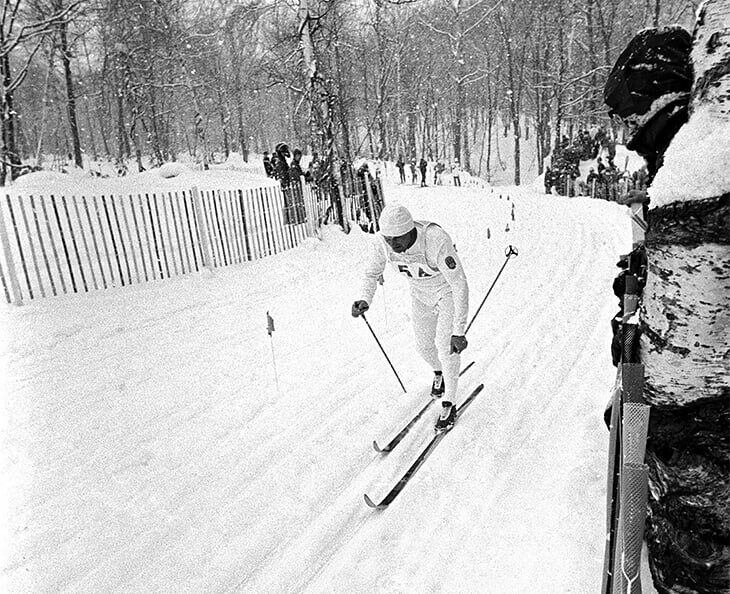 Веденин убежал в гонку под снегопад, и поначалу казалось, что у него неприятности – на отметке 10 км только седьмое время. Но уже к 20 км все изменилось: советский лыжник выбрался в лидеры с преимуществом в 11 секунд. А дальше только наращивал темп и финишировал первым, опередив ближайшего конкурента почти на минуту.