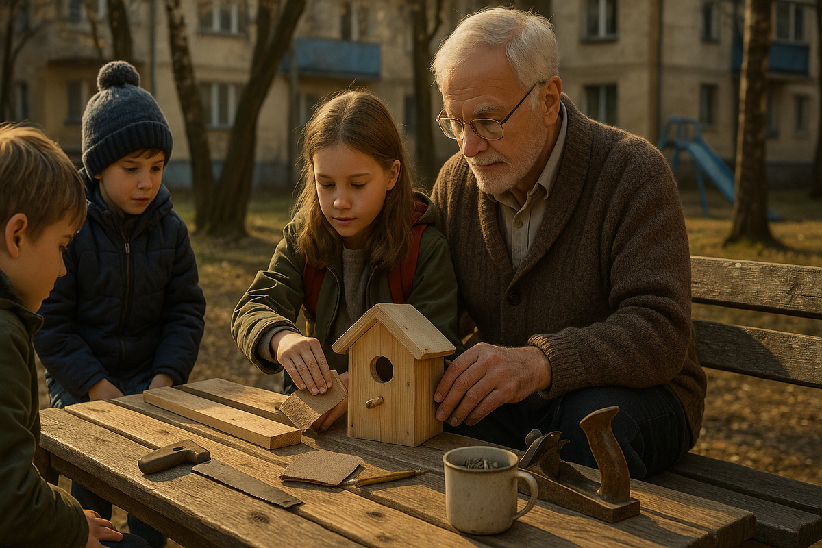Слух о скворечниках полетел по двору быстрее весеннего ветра. Приходили ребята из соседних подъездов, кто‑то приводил младших братьев и сестёр. У каждого было своё: у Лёши — ловкость пальцев, у Даши — глазомер, у Миши — сила, у Тимура — терпение. Они говорили о школе, делились печеньем, перебивали друг друга, и Иван Петрович учился заново слышать разговоры, где не было ни слова про давление и лекарство.