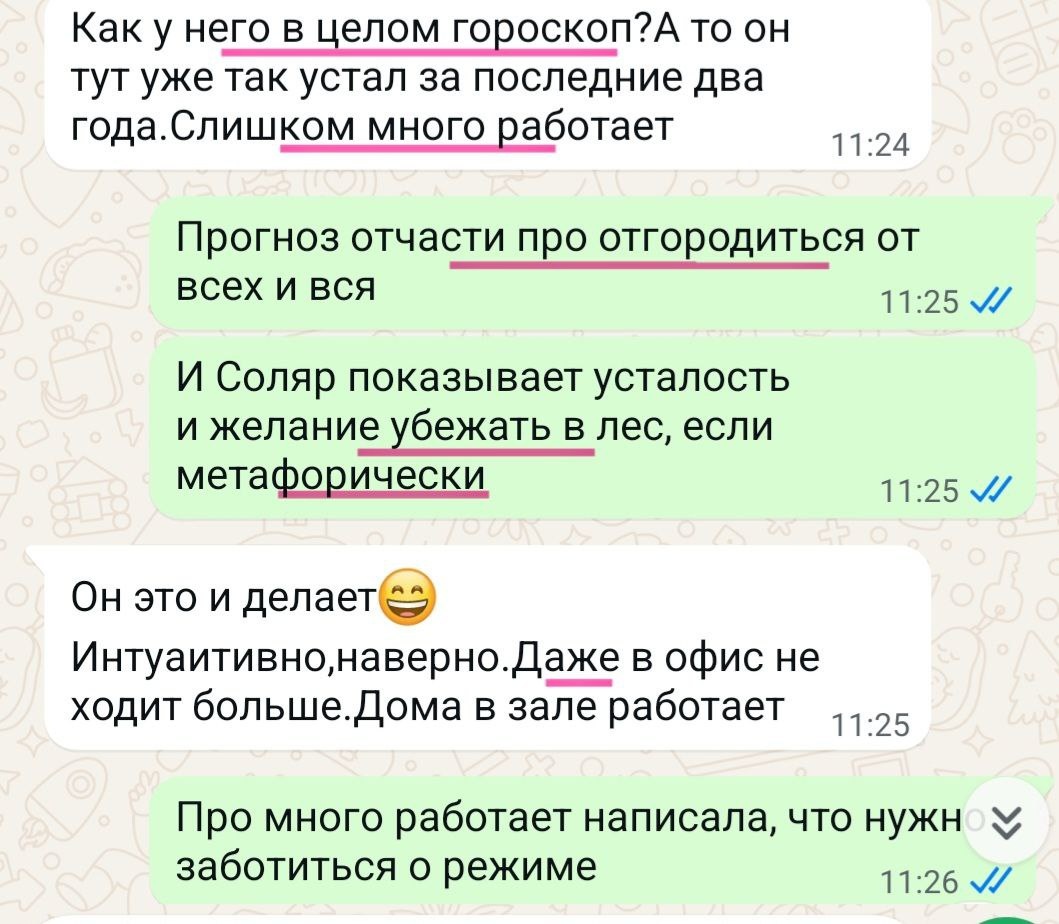 💥КОГДА МУЖЧИНА ГОТОВ... У меня есть постоянная клиентка, и после получения своего прогноза на год, она попросила такой же подготовить для мужа. В данном случае, всегда спрашиваю, это чьё желание заказать прогноз? Это важно, с точки зрения этики работы астролога. После общаюсь с самим заказчиком, информацию отправляю только ему. А если партнер волнуется по какому-то поводу, могу обозначить то, что и так видно его половине, не более. ❓Почему и когда даже мужчины могут обращаться к астрологу, если до этого не верили во всё это "мракобесие"? ◻️Ответ в прогнозе и периодах, которые мы проживаем. В прогнозах, когда даже скептики начинают верить в невидимое большой акцент на 12 поле. Оно же про усталость и желание спрятаться в нору и передохнуть. Сегодня смотрю сторис одной девушки. Она всегда очень активна. Я брала у неё рекламу в Иг и делала на прошлый год прогноз. И в прошлом году год говорил, что будет много работы, успеха, путешествий. Так и было - это она транслировала и об